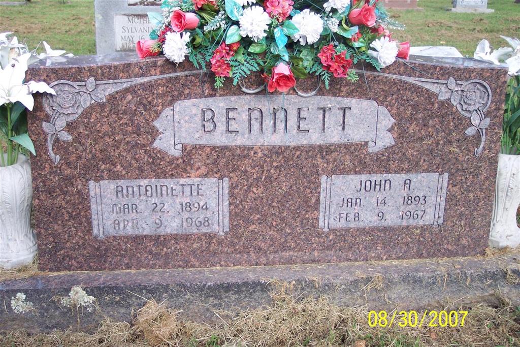 SSW: Antoinette - Research Note: Son of John Alec Bennett and Rosa Etta Cookston. - Funeral services for John A. Bennett, 74, Route 2, Crane, was at 2 p.m., Sunday, in Clio Church with Elder Oliver Coones officiating. Burial was in Old Carney Cemetery under the direction of Manlove-Stumpff Funeral Home of Crane, Missouri. Mr. Bennett, a resident of Cape Fair and Jenkins most of his life, died at 4 p.m., Thursday, in his home after suffering an apparent heart attack. Surviving are his wife, Antoinette; a daughter, Mrs. Wilma Gentry of Santa Maria, California, Ray of Carthage, Tennessee, John A. Jr. of Marionville, Missouri, and Earl of Springfield, Missouri; a sister, Mrs. Cora Hudson of Jenkins, Missouri; 14 grandchildren and five great-grandchildren. | Census Obit Death Certificate Phyllis Long Photo Diana Cope |