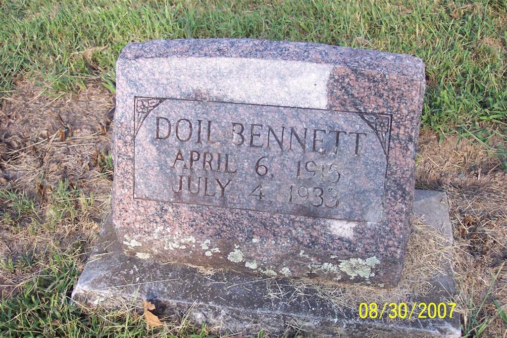 Research Note: His death certificate has his name spelled Doyl and not Doil as his stone reads. His father's name was given as Albert Bennett and his mother's name was given as Delitha Harris. His birth date was given as July 4, 1915. His death was caused by meningitis after a head injury. Dale Bennett of Cape Fair, MO, gave the information. Delitha is what was written but it probably should read Telitha. | Death Certificate Donna Cooper Photo Diana Cope |