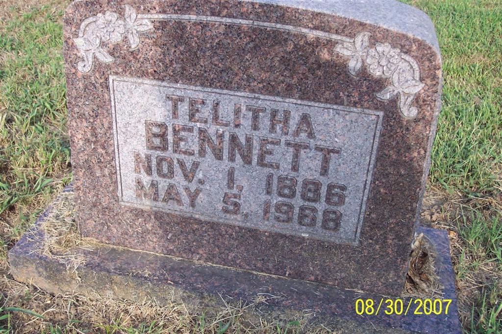 Research Note: Buried next to William Albert Bennett. Daughter of James Washington Harris and Minerva Jane Seagraves. Mrs. Dean Brooks of Cassville, MO was the informant on the death certificate. - Talitha Harris, age 18, married William A. Bennett, age 24, on Dec. 6, 1904 in Barry Co., MO. | Census MO Marriage Records Death Certificate Phyllis Long Photo Diana Cope |