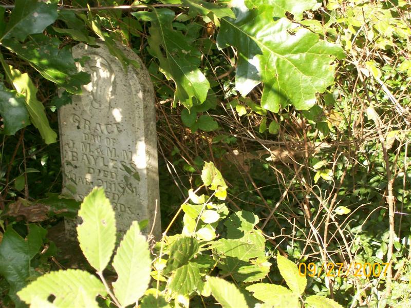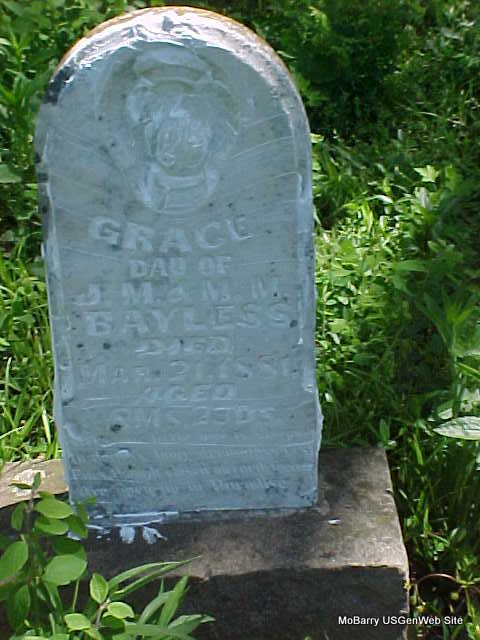 | BAYLESS, Grace | 1880 | Mar. 21, 1881 | Inscription: "Dau. of J .M. and M. M. BAYLESS, Here our little one is, Sleeping in deaths long dream less rest, eyes tho closed on earth ___" "Age 8 mo. 23 days" - Research Note: Daughter of John Melville Bayless and Mary Melissa Stubblefield. - Bayless Family History - Another Photo | Bayless History Phyllis Long Headstone Mary Homesley |