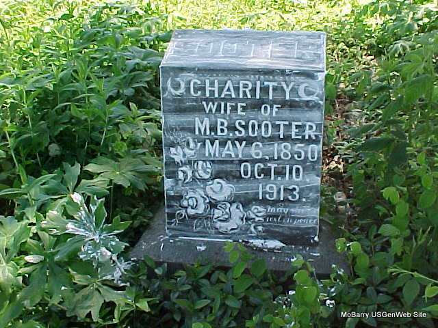 Inscription: "Wife of M. B. Sooter, may she rest in peace" - Research Note: her death Certificate has her birth date as Apr. 5, 1850. She was widowed and the daughter of William and Elizabeth (Kyle) Earl, both born OH. D. L. Mitchell of Cassville, MO was the informant. Charity Earle first married Elias Owens on Jan. 29, 1871 in Barry Co., MO. Charity Owens second married Martin VanBuren Sooter on Mar. 26, 1899 in Barry Co., MO. 1880 census, she was living with her father William Earle and son Charles A. Owens, listed as divorced. Martin is buried at Bethel Baptist Cemetery near Monett, MO. - October 16, 1913, Thursday, Cassville Republican - Mrs. Charity Sooter, wife of the late M. V. Sooter, died at the home of her nephew, Grant Stubblefield, southeast of town, Friday afternoon, October 10, of complication of diseases, age 63 years, 5 months and 6 days. | Death Certificate MO Marriage Records Census Online Newspapers Phyllis Long Headstone Mary Homesley |