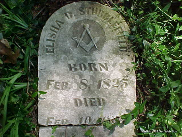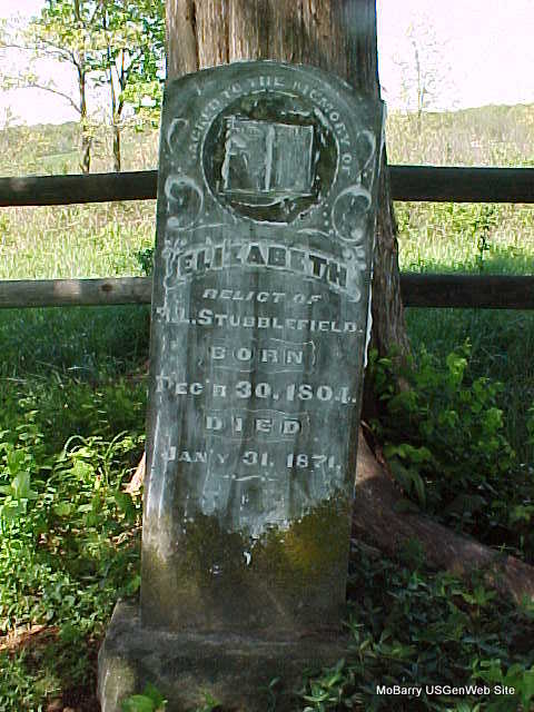 | STUBBLEFIELD, Elizabeth | Dec. 30, 1804 | Jan. 31, 1871 | Inscription: "Relict of R. L. Stubblefield" - Research Note: Elizabeth Dodson married Robert Loxley Stubblefield in 1821. Researchers say she was the daughter of Elisha Dodson and Mary Matlock. | International Marriage Index Phyllis Long Headstone Mary Homesley |
