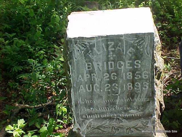 Aug. 23, 1893 | Inscription: "MOTHER, Where mortal spirits reign, There we shall meet again" - Research Note: Daughter of George Washington and Letha Jane (George) Edens. Eliza E. Edens married William Bridges on May 26, 1873 in Perry Co., IL. - 1870 Census, Township 4 Range 2, Perry, Illinois - George W. Edens, age 47, farmer, born VA; Letha J., age 46, born VA; Eliza E., age 15, born IL. - 1880 Census, Sugar Creek, Barry Co., MO - Wm Bridges, Self, Married, Male, White, age 28, born IL, Work on Farm, father born TN, mother born TN; Eliza Bridges, Wife, Married, Female, White, age 26, born IL, Keeping House, father born VA, mother born VA ; Laura Bridges, Dau, S, Female, White, age 6, born IL, At Home, IL, IL ; Daniel Bridges, Son, S, Male, White, age 4, born IL, At Home, IL, IL ; Fannie Bridges, Dau, S, Female, White, age 2, born MO, At Home, IL, IL; James Bridges, Son, S, Male, White, age 8 Months, born MO, At Home, IL, IL. | Census IL Marriage Index Goodspeed Phyllis Long Headstone Mary Homesley |