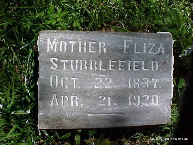 Inscription: "MOTHER" - Research Note: Daughter of William Earle and Elizabeth Kyle. Wife of Elisha Dodson Stubblefield. - Cassville Republican Oct. 2, 1919 - Mr. and Mrs. R. L. (Robert Loxley) Stubblefield southwest of Cassville gave a dinner Sunday at their home complimentary to Mr. Stubblefield's mother, Mrs. Eliza Stubblefield, of Claremore, Okla., who has been visiting the past few weeks at the homes of her sons, R. L., Grant and Arthur and with her brother, George Earle. A large number of relatives and friends and former neighbors of Mrs. Stubblefield were present and enjoyed the day together. At the noon hour a large table was arranged on the lawn and loaded with good things to eat. Everybody present did justice to the occasion. The REPUBLICAN was warned by George Weatherly and George Earle not to mention their names in connection with the dinner for that reason we will not do so, Mrs. Stubblefield will be 82 years old this month. - Cassville Democrat, Apr. 24, 1920 - There was joy in Heaven on the arrival of the spirit of an excellent woman, wife, mother and citizen who beamed with goodness and lovely character of sweetness, that was beautifully illustrated in her every day walk of life, that ended in causing the world to be better. "One sweetly solemn thought", of hers was to do and be good. She has left the example for her loved ones and many friends to follow. Miss Eliza Earle was born in Pike Co., IL, Oct. 22, 1837 and was a daughter of late Mr. and Mrs. William Earle. Her parents moved to TX in 1848 where she grew to womanhood and there was married to the late Elisha Stubblefield who died some 43 years ago, at his home two and one-half miles SW of this city. They came to Barry Co. in 1868 and both enjoyed the highest respect and esteem of all their acquaintances. Eight children were born of this marriage and those living are: Mrs. Mary M. Bayless, Claremore, OK; Lock and Grant Stubblefield of near this city and Arthur Stubblefield of near Eagle Rock. On Apr. 14 while she and her daughter Mrs. Mary M. Bayless were visiting her grandson Ross Bayless and family at Miami, OK, she fell down a flight of stairs and injured herself so badly that she died from the injuries, Wed., Apr. 21, 1920, at the ripe age of 82 years, 8 months, and 29 days. Funeral services were conducted at Miami, OK, Thursday, by Rev. Stubblefield, a nephew, and the remains were shipped to this city Thursday afternoon and conveyed to the Baptist church where another service was conducted, Friday Apr. 23, at 2 p.m. by Rev's. Stubblefield and Brattin, after which the remains were conveyed to the Stubblefield Cemetery, 3 and 3/4 miles SW of this city and there consigned to a last resting place beside her beloved husband. She was a sister of George Earle of near this city. Her daughter, Mrs. Mary M. Bayless and sons Guy, Ross, Bourke and Mesdames Ross and Bourke, Bayless accompanied the remains to her old home for interment. Many beautiful flora emblems were sent, in token of love and high respect for this good woman. | Cassville Democrat Goodspeed Phyllis Long Headstone Mary Homesley |