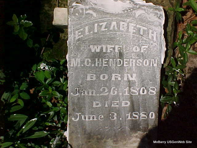| HENDERSON, Elizabeth H. | Jan. 26, 1808 | June 3, 1880 | Inscription: "Wife of M. C. Henderson" - Research Note: Clasp Hands on stone. - 1870 Census, Barry Co., MO - M. C. Henderson, age 64, TN, white, male; Elizabeth, age 64, VA, white, female; Martha, age 18, TN, white, female. | Census Phyllis Long Headstone Mary Homesley |