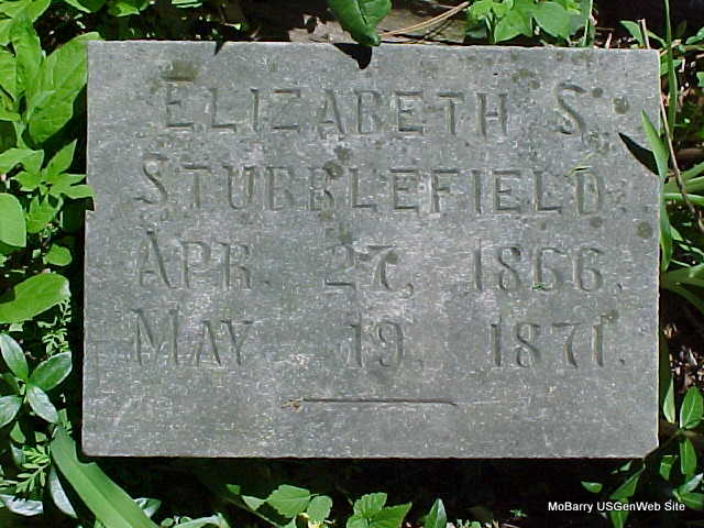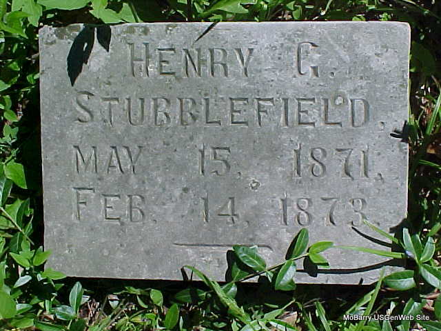 | STUBBLEFIELD, Henry G. | May 15, 1871 | Feb. 14, 1873 | Research Note: Maybe the son of Elisha Dodson Stubblefield and Elizabeth Earle. Stone matches the ones for Elisha, Elizabeth, and sister Elizabeth S. | Note Phyllis Long Headstone Mary Homesley |