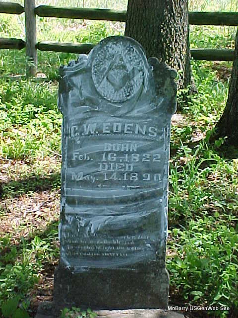 Research Note: Goodspeed History of Barry County, states that he was born in 1818 but his tombstone reads Feb 16, 1822. - Goodspeed's 1888 History of Barry Co. MO - George W. Edens was born in 1818 in Patrick Co., VA and is the son of David and Elizabeth (Harris) Edens, both native Virginians. David Edens was drafted into the War of 1812, and proceeded to Norfolk, VA to enter the service but peace was declared, and he was mustered out before he did any fighting. He was a farmer and hatter by occupation, and died in 1852. By his first marriage he was the father of 2 children, Alia and James. By his marriage with Elizabeth Harris he was the father of 7 children, six of whom lived to be grown. They are Jesse, who died and was buried in Ashley, IL; Lydia, who married John Harris, and lives near the line between WV and TN; Andrew Jackson, a farmer, who resided in Lee Co., WV; Henry Harrison, who was killed by a train, and was buried in Ashley, IL; George W.; William Green, who was killed in Owsley Co., KY, in 1881, by one Collins; and Claiborn, a farmer living on the Blue Ridge Mountains in VA. George W. was reared in his native state and about 1840 married Letha Jane George. He left VA in 1852, and removed to Andrew Co., MO, but in the autumn of the next year migrated to Perry Co., IL, where he remained until 1875, when he came to Barry Co., MO. Mr. Edens is a Democrat of the old school, having cast his first vote for Van Buren. He is a member of the Masonic fraternity. His wife is the daughter of James and Delilah George, who were natives of VA. She was born on Dec. 21, 1824 and is a consistent member of the Baptist Church as is also her husband. They have had five children (4 of whom are living): Ellis H., deceased; James Jefferson, who was a soldier in the Union army, and now lives in Barry Co.; Celia (Mrs. Joseph Hutts); Delilah Jane (Mrs. John Reidelbarger); and Eliza Elizabeth (Mrs. William Bridges). Mr. Edens had 160 acres of beautiful bottom land, which he has brought to a fine state of cultivation. | Goodspeed Phyllis Long Headstone Deceased Beverly Matthews |