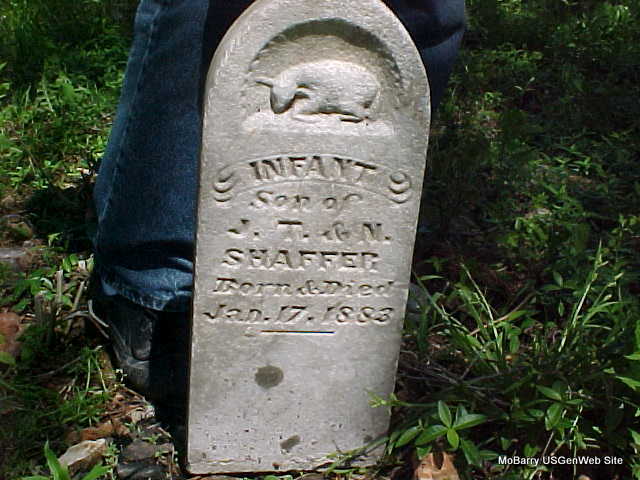 | SHAFFER, Infant | Jan. 17, 1883 | Jan. 17, 1883 | Inscription: "Son of J. T. and M. Shaffer" | Headstone Mary Homesley |