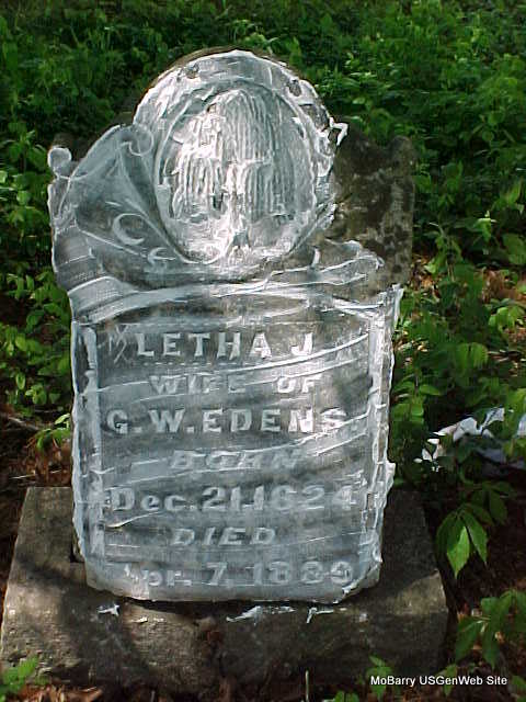 Research Note: She was the wife of George Washington Edens. Daughter of James George and Delilah Edds. - 1880 Census, Barry Co., MO - Washington Edens, Self, Married, Male, White, age 59, born VA Farmer, father born VA, mother born VA, Crippled or Handicapped; Letha Edens, Wife, Married, Female, White, age 48, born VA, Keeping House, father born VA, mother born VA. | Census Goodspeed Phyllis Long Headstone Deceased Beverly Matthews |