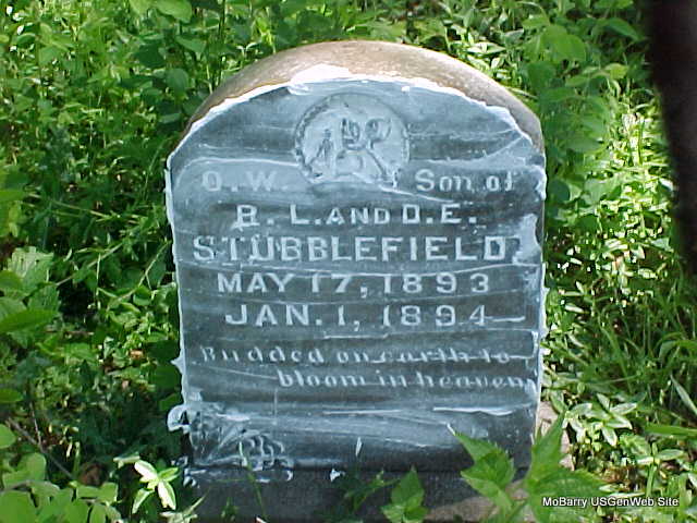 | STUBBLEFIELD, Orris Wayne "O. W." | May 17, 1893 | Jan. 1, 1894 | Inscription: "Budded on earth to bloom in heaven, son of R. L. and D. E. Stubblefield" - Research Note: Rose petals carved in stone. Son of Robert Loxley Stubblefield and Dora Elizabeth Meador, buried at Maplewood Cemetery. | Note Phyllis Long Headstone Mary Homesley |