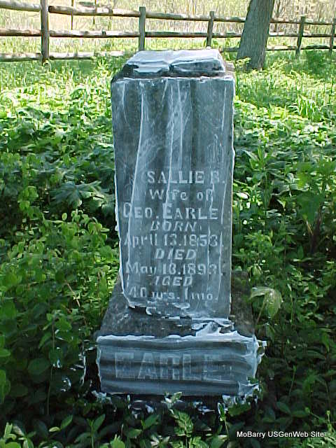 May 13, 1893 | Inscription: "Age 40 yr. 1 mo., Wife of George Earle" - Research Note: Daughter of George Washington House and Rebecca Elizabeth Williams. Sally House married George Earle on Feb. 5, 1871 in Barry Co., MO. George was the son of William Earle and Elizabeth Kyle and he is buried at Antioch Cemetery. | MO Marriage Records Census Phyllis Long Headstone Mary Homesley |
