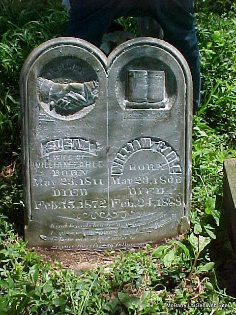 SSW: Susan Earle - Research Note: Bible carved in his side of stone. - Goodspeed's 1888 History of Barry Co. MO - William Earle, one of the oldest and most highly respected citizens of Barry Co., and once president of the board of directors of the Barry Co. Bank at Cassville, was born in Ross Co., OH, on May 23, 1896. He is a son of Grantham and Margaret (Hewitt) Earle, natives of Maryland and Pennsylvania, respectively. In his youth Grantham Earle followed the sea, and while yet a young man went into Ross Co., OH, and worked at the brick mason's trade and engaged in farming on a small scale. During the War of 1812 he was taken prisoner on a man of war, but escaped with only a part of his clothing. One foot being bare, and the weather very cold, his foot was so severely frozen that he remained a cripple for life, his death occurring near Lower Sandusky, OH in 1853, at the age of 96 years. His wife was a daughter of Thomas Hewitt, who served in the commissary department in the Revolutionary War. He was a man of more than ordinary intelligence and business capacity, and was a member of the Legislature of his native state. He died at the advanced age of 104 years in Ross Co. OH. Mrs. Earle was twice married and by her first marriage with Jesse Funston, she was the mother of 3 children, the subject of this sketch being the only one living. He grew to manhood on a farm, making his home with his father until he was 21 years of age. He received his education by private instruction, and when he left his father's house engaged in teaching school, which he continued for several terms. In 1834 he married Elizabeth Kyle, who was born in 1814, in Ross Co. OH and soon after removed to Pike Co., IL, locating on a farm of 100 acres. In 1853 he removed to Bell Co., TX and remained until 1866 when he came to Barry Co., MO, locating two miles north of Cassville. Mrs. Earle died in 1853. There are 4 children living by this marriage: Eliza (widow of Elisha Stubblefield of Barry Co.), Mary (wife of George J. Elam, of Marlin, TX), George (a farmer of Barry Co.), and Charity (widow of Elias Owens, who now resides with her father). In 1855, Mr. Earle married Susan Kyle a sister of his first wife, by whom he has one child, Charles, a farmer of Barry Co. His second wife died in 1873 and the following year, Mr. Earle married Mrs. Miriam Williams, nee Forbis, who was born in Barry Co. She died in 1878. Mr. Earle commenced life as a poor man, working for $9 per month after leaving the parental roof, but he has been very active and industrious, and has been successful in all his business transactions, and has accumulated property that affords him a good income. In Jan. 1887 the Barry Co. Bank was established, and Mr. Earle was elected president of the board of directors. His honesty and integrity have never been questioned, and he is held in high esteem by all who know him. In politics he is a Republican, having been a Jackson Democrat before the war. His first vote was cast for Jackson in 1828, and he has voted in every presidential election since. In religion he holds to the Methodistic doctrine. "Uncle Billy", as he is familiarly called, reared and now owns a bald face sorrel horse, named "Ball", 33 years old, and is yet a nimble and serviceable horse,. They have grown old together and are much attached to each other. Death alone will separate them. - Another Photo | Goodspeed Phyllis Long Headstone Mary Homesley |