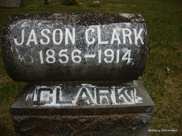 Research Note: He died at age 56 years, 2 months, 17 days. Tombstone has birth year as 1856. Death Certificate has 1858. The cause of death listed as aortic insufficiency. - Stefanie added - Death Certificate: Jason Clark was a son of Ebenezer Clark, born OH and Mary Richmond born WV. The cause of his death was given as aortic insufficiency in Aurora, Lawrence Co., MO and he was married and a farmer, MO. The informant was Mrs. Louisa Clark of Aurora, MO. - Jason Clark married Louisa Jackson on Mar. 17, 1887 in Lawrence Co., MO. Grave #413. | King Funeral Home Jay Trace Death Certificate Stefanie Forester MO Marriage Records Phyllis Long Photo Connie Schmidt |