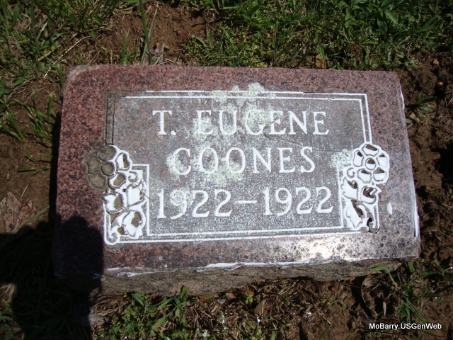 Research Note: Death certificate is under William Eugene Coones. Dates match for Thomas Eugene. There is no death certificate for T. Eugene. This stone could be for William Eugene but was actually T. Eugene. Son of T. C. Coones and Louise Rickman, both born Barry Co., MO. T. C. Coones of Elsey, MO was the informant. Thomas Clement Coones, died 1941, is buried at Doty Cemetery. Sarah Louise (Rickman) (Coones) Underwood, died 1979, is buried at Maple Park Cemetery, Aurora, Lawrence Co., MO. | Death Certificate Phyllis Long Photo Connie Schmidt |