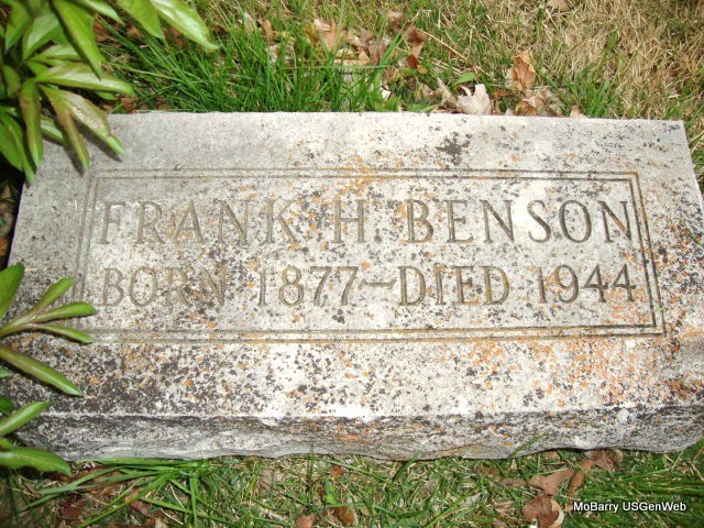 Research Note: His wife was Martha E. Benson and he was a farmer. The son of Jonathan Benson born IN and Sarah J. Fierce born OH. His wife was the informant on the death certificate. Grave #457. | Death Certificate Phyllis Long Headstone Marc Houseman Photo Connie Schmidt |