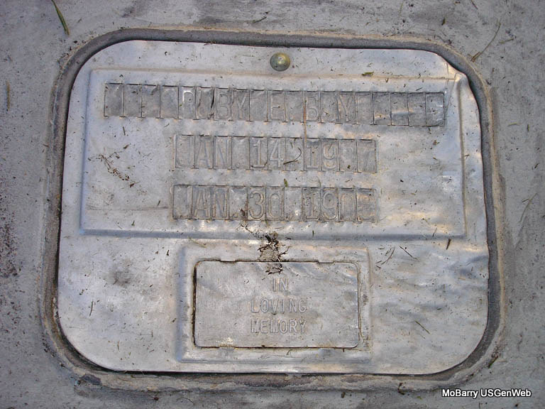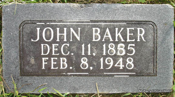 Research Note: Husband of Sarah Jane Farmer. His father was William Baker born IL and mother not given. Also, on his stone the second 8 in 1885 is actually a 5 and a 3 carved over one another. Birth date on the death certificate is Dec. 11, 1855 and death date is Feb. 10, 1948. Mrs. Alice Breakbuehler of Aurora, MO was the informant. Grave #280. | Death Certificate Phyllis Long Photo Note Stefanie Forester |