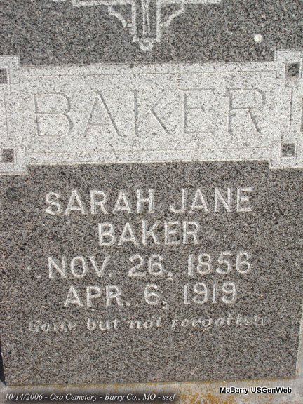 | BAKER, Sarah Jane (FARMER) | Nov. 26, 1856 | Apr. 6, 1919 Madry, Barry Co., MO |