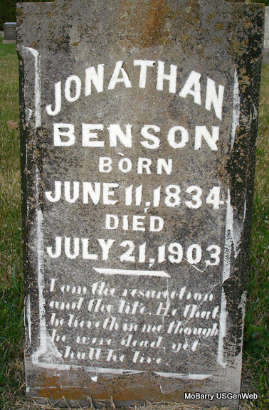July 21, 1903 | Research Note: Died a married farmer at age 69 years, 1 month, 10 days. Killed in Aurora on West Church Street in runaway accident. Jonathon Benson married Sarah J. Fierce on Mar. 1, 1860 in Laporte Co., IN. Grave #456. | Headstone Marc Houseman King Funeral Home Jay Trace IN Marriage Index Phyllis Long Photo Stefanie Forester |