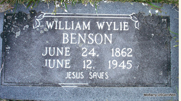 Inscription: "Jesus Saves" - Research Note: He was widowed twice and his wife's name was Addie. He was an optometrist and a son of Jonathan Benson, born IL, and Sarah J. Fierce, born IL. Mrs. Ethyl Koening of Billings, MO was the informant on the death certificate. His wife in the 1900 census was Addie. She was Addie Etta Jones. His wife in the 1910 census was Etta. - Christian Co. Republican, June 21, 1945 - William Wylie Benson was born in the state of Indiana June 24, 1862, and departed this life June 12, 1945, at the age of 82 years, at the home of his daughter, Mrs. Ethel Koenig in Billings, Mo., following a lingering illness. On Oct. 3, 1893, he was united in marriage to Miss Addie Jones, who preceded him in death 14 years ago. To this union were born seven children. One son, Robert L. Benson, passed away at the early age of 30. Mr. Benson had long been a resident of Aurora and its vicinity and had formed many friendships that he valued highly. His early boyhood days were on the plains of central Kansas but the greater part of his life had been spent in the Ozarks. He served as an officer of the law in Greene county and at the age of 21 lost a limb in a railway accident at Dennison, Texas, while in the employ of the M.K. and T. Railroad. He professed faith in Christ at an early age and held steadfastly to it. He is survived by three sons, W. J. Benson of Oklahoma City, Okla., C. F. Benson of Wellington, Kans., and I. M. Benson of Phoenix, Ariz.; three daughters, Mrs. Ethel Koenig of Billings, Mrs. Adalene Gimlin of Yakima, Wash., and Mrs. Pauline Sweeney of San Diego, Calif.; one step daughter, Mrs. Viola Carsten of Minneapolis, Minn.; 18 grandchildren and five step grandchildren; and one sister, Mrs. Augusta Aton of Golden City, Mo. Funeral services were held Sunday afternoon, June 17, in the King Funeral Home at Aurora with burial in the cemetery at Osa. - Grave #454. | Death Certificate Obit Phyllis Long Photo Stefanie Forester |