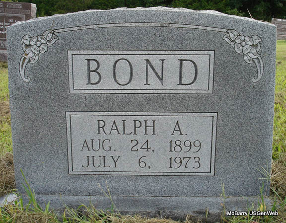 | BOND, Ralph Amos | Aug. 24, 1899 | July 6, 1973 | Research Note: Son of Carroll T. and Victoria Bond. Ralph bond married Ada Simpson on Feb. 17, 1917 in Stone Co., MO. C. T. Bond, father of Ralph, and G. O. Simpson, father of Ada, gave consent. Ada died in 1979 and is buried at Nolan Cemetery, Stone Co., MO. Grave #538. | Census MO Marriage Records Phyllis Long Photo Stefanie Forester |
