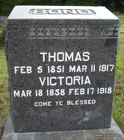 | BOND, Victoria (HEMPHILL) | Mar. 18, 1858 | Feb. 17, 1918 | SSW: Thomas Bond - Inscription: "Come Ye Blessed" - Research Note: Victoria A. Hemphill was a daughter of William Patton Hemphill and Milly A. Triplett. C. T. Bond married Victoria Hemphill on Mar. 10, 1887 in Barry Co., MO. - Grave #537 | Photo Stefanie Forester Census MO Marriage Records Phyllis Long |