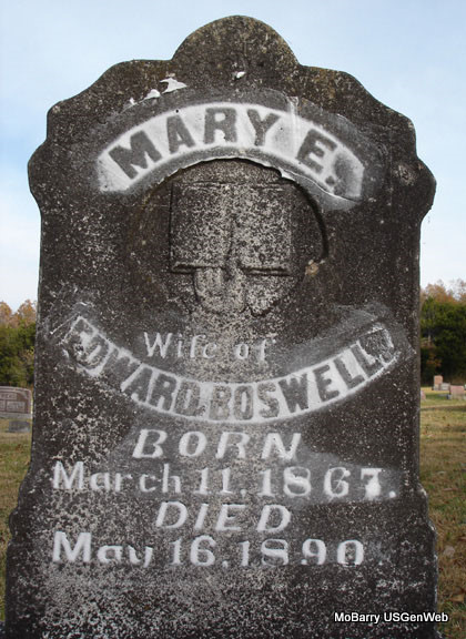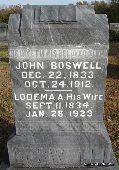 | BOSWELL, Edward | July 17, 1858 | June 12, 1921 | Inscription: "Gone But not Forgotten" - Research Note: Son of John Boswell and Lodema Adeline Colclasure. First wife was Mary E. Wise, married Mar. 3. 1887 in Barry Co., MO, died 1890. His second wife was Mary O. Hilton, married July 12, 1900. Mary Olive (Hilton) (Boswell) Allmon is buried at Leann Cemetery under Allman. - November 19, 1914, Thursday, Cassville Republican - Leann News: Lottin and Lutman Bacon of Fairland, Okla., sons of George Bacon of Zena, Okla., are visiting their uncle, Edward Boswell of this place and their grandmother, Mrs. Boswell of Madry. - Grave #98. | Census MO Marriage Records Online Newspapers Phyllis Long Photo Stefanie Forester |