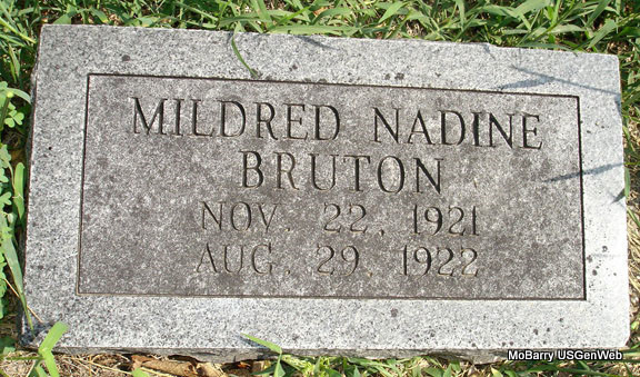 | BRUTON, Mildred Nadine | Nov. 22, 1921 | Aug. 29, 1922 | Research Note: She was the daughter of William David Bruton and Mary Susan Johnson. Grave #69. | Notes Phyllis Long Photo and Note Stefanie Forester |