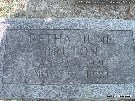 | BRUTON, Retha June | Jan. 26, 1920 | Nov. 9, 1920 | Research Note: She was the daughter of William David Bruton and Mary Susan Johnson. Grave #70. | Notes Phyllis Long Photo and Note Stefanie Forester |