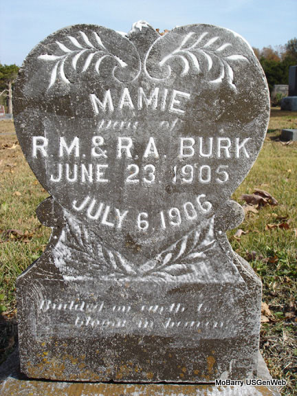 | BURK, Mamie | June 23, 1905 | July 6, 1906 Near Madry, Barry Co., MO |