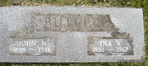 SSW: John N. - Research Note: Daughter of William Harvey Garrison and Maggie Ellen Gold. Elmer Butler of Cassville, MO was the informant on the death certificate. John Butler married Ina Garrison on Mar. 21, 1913 in Barry Co., MO. Grave #586. | Death Certificate MO Marriage Records Phyllis Long Photo Stefanie Forester |