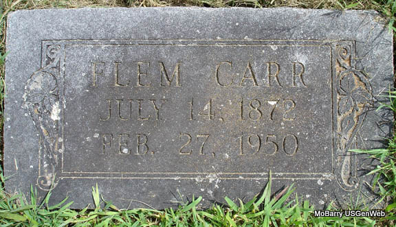 Research Note: Son of Samuel Carr and Minerva Cain. His death was caused by nephritis (rectal hemorrhage). He died in Aurora, Lawrence Co., MO, was retired and married to Cora Carr. Informant: Morris Carr of Aurora, MO. Death certificate listed under Flen Carr. Flem Carr, age 62, second married Cora Pierce, age 58, on Feb. 5, 1934 in Aurora, Lawrence Co., MO. Grave #546. | SS Claims Index Census MO Marriage Records Phyllis Long Photo Death Certificate Stefanie Forester |