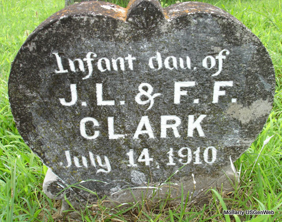 | CLARK, Infant | July 14, 1910 | July 14, 1910 | Inscription: "Infant Dau. of J. L. and F. F. Clark" - Research Note: Daughter of Jonathan Lewis Clark and Fannie Fink. Grave #174. | Note Phyllis Long Photo Stefanie Forester |