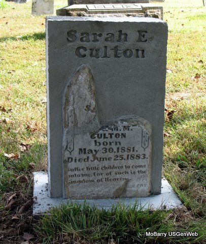 | CULTON, Infant | Mar. 1870 | Mar. 1870 | Inscription: "Infant of J. W. and M. M." - Research Note: He was a son of James Wood Culton and Matilda Malinda (Lawson)(Ellis) (Short) (Culton) Carney. | Photo Stefanie Forester Family Knowledge Judy Wilson |
