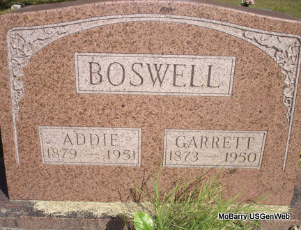 SSW: Garrett - Research Note: According to her death certificate her father's name was Will Wilson and her mother's name was Jane Wilson. She was widowed and Garrett Boswell was listed as her husband. George Boswell of Aurora, MO, gave the information. Death Cert: Daughter of Will Wilson and Nancy Jane Wilson. died of cerebral apoplexy in Ozark, Barry Co., MO, she was a housewife, married twice and died a widow of Garrett Boswell. Informant: Garrett Boswell, Aurora, MO. - Addie Mullins, age 21, married Garrett Boswell, age 26, on Nov. 22, 1900 in Barry Co., MO. - Grave #179 | Photo Death Certificate Stefanie Forester Death Certificate Donna Cooper MO Marriage Records Phyllis Long |