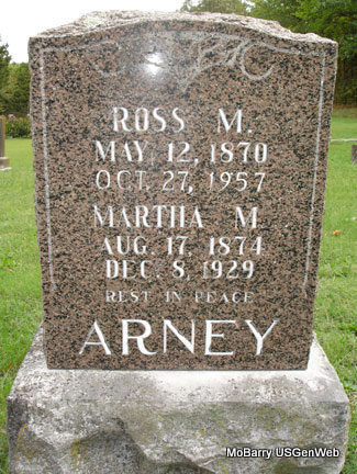 SSW: Ross M. - Inscription: "Rest in Peace" - Research Note: Died of cancer of stomach (Death certificate says diabetes). Father listed as W. R. Johnson of TN. Mother Susan Parks of TN. She was listed as Martha A. Arney nee Johnson. M. J. (must be M. R. for Ross), age 25, married Martha M. Johnson, age 21, on Dec. 10, 1895 in Barry Co., MO. - Grave #365 | Photo Stefanie Forester Death Certificate King Funeral Home Jay Trace MO Marriage Records Phyllis Long |