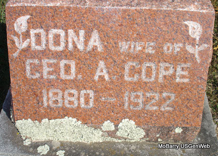 Inscription: "Wife of George A. Cope" - Research Note: First wife of George Alonzo Cope. Her death certificate reads that her father was Hiram Garner, born in IL, and that her mother was Fannie Hamby, born in MO. She was married and George Cope was given as her husband. Mrs. Mary Forester of Marionville, MO, gave the information. Stefanie added - Death Certificate reads that Donna Gardner was a daughter of Hiram Garner (born IL) and Fannie Hamby (born MO). She died July 26, 1922, which is a different date from the stone date that Stefanie posted. Death was due to post-operative shock in Aurora, Lawrence Co., MO, she was a housewife and married to George Cope. Informant: Mrs. Mary Forester of Marionville, MO. Grave #210. | Death Certificate Donna Cooper Photo Death Certificate Stefanie Forester |
