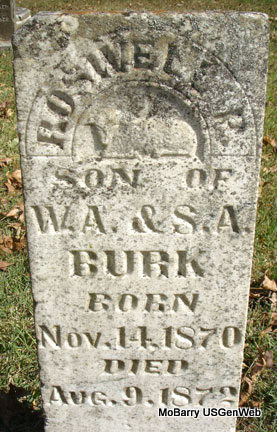 | BURK, Roswell P. | Nov. 14, 1870 | Aug. 9, 1872 | Inscription: "Son of W. A. and S. A." - Research Note: Grave #462. | Photo Stefanie Forester |