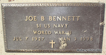 | BENNETT, Joe Bob | July 7, 1927 | Jan. 3, 1998 | SSW: Phyllis Jean - Research Note: Son of Willard T. Bennett and Donna Jones. - Military Stone - Inscription: "S1 US NAVY WORLD WAR II" | SS Claims Index Phyllis Long Photo Stefanie Forester |