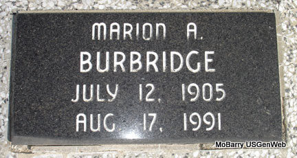 | BURBRIDGE, Marion A. | July 12, 1905 | Aug. 17, 1991 | Research Note: Son of George Truman Burbridge and Rosa Ann Ray. He married Lela Faye McCullah. | Census Phyllis Long Photo Stefanie Forester |