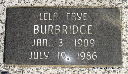 | BURBRIDGE, Lela Faye (McCULLAH) | Jan. 3, 1909 | July 19, 1986 | Research Note: Daughter of William Albert McCullah and Laura Belle Kirby. Marion Burbridge married Faye McCullah on Apr. 10, 1925 in Barry Co., MO. Truman Burbridge, father of Marion, and W. A. McCullah, father of Faye, gave consent. | Census MO Marriage Records Phyllis Long Photo Stefanie Forester |