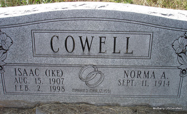 SSW: Isaac "Ike" - Inscription: "Married Mar. 12, 1931" - Research Note: Daughter of Caleb Sewell Brooks and Ivy Temple Johnson, was born September 14, 1914 in Hall County near Turkey, Texas and departed this life May 2, 2012 in Windcrest Nursing Home and Rehab Center in Fredericksburg, Texas at the age of 97. Norma was united in marriage to Ike Cowell on March 12, 1931 in Ellis Co., OK and celebrated their 67th anniversary before Ike passed in 1998. They moved to Crane, MO in 1963 when Ike elected to retire early after 30 years with Phillips Petroleum Company. Norma, who grew up as a Texas farm girl before becoming an oil field wife, was not hesitant to return to the Ozarks with him. She spent 32 years with Ike on their farm that ran along Crane Creek in Barry County. Then, in 1995, they moved to Houston, Texas to be near their son. Until they moved, Ike and Norma were members of Mountain Home Church of Christ near Galena, Missouri. Norma was preceded in death by her parents; thee sisters; husband, Ike Cowell, and one son, Steve Delton Cowell. | Manlove-Stumpff Funeral Home Phyllis Long Photo Stefanie Forester |