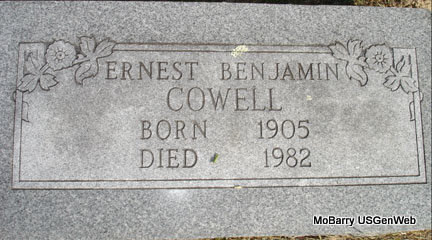 | COWELL, Ernest Benjamin | 1905 | 1982 | Research Note: Son of William Monroe Cowell and Nina Jane Hall. Single, age 34, living in Borger, Hutchinson, Texas in the 1940 census. | Census Phyllis Long Photo Stefanie Forester |
