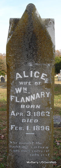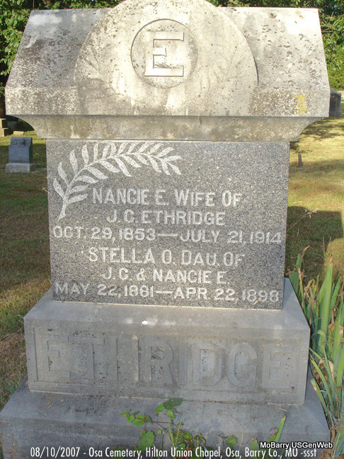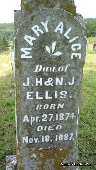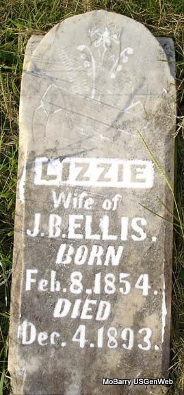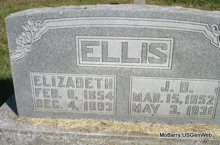 | ELLIS, Nancy Elizabeth (WILSON) | Feb. 8, 1854 | Dec. 4, 1893 | SSW: Jeremiah Bynum Ellis - Research Note: Elizabeth Wilson was a daughter of David Alexander Wilson and Amanda Burk. First wife of Jeremiah B. Ellis. Nancy E. Wilson married Jeremiah B. Ellis on Nov. 2, 1873 in Barry Co., MO. - Another Stone - Inscription: "Wife of J. B. Ellis." | Goodspeed's History MO Marriage Records Phyllis Long Photo Stefanie Forester |