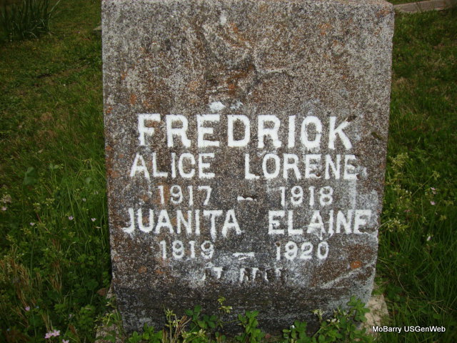 SSW: Juanita Elaine Frederick - Research Note: Her death certificate reads that her father was W. B. Fredrick, born Green Forrest, AR, and that her mother was Etta Friend, born MO. Her name is spelled Alice Loreen on the document and is incorrectly indexed as Allice. She was age 1 year, 3 months and 23 days old when she died. Callaway Funeral Home was the undertaker. Grave #361. | Death Certificate Donna Cooper Photo Connie Schmidt |