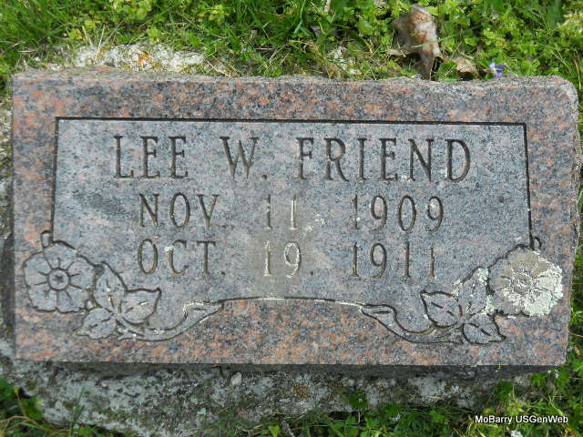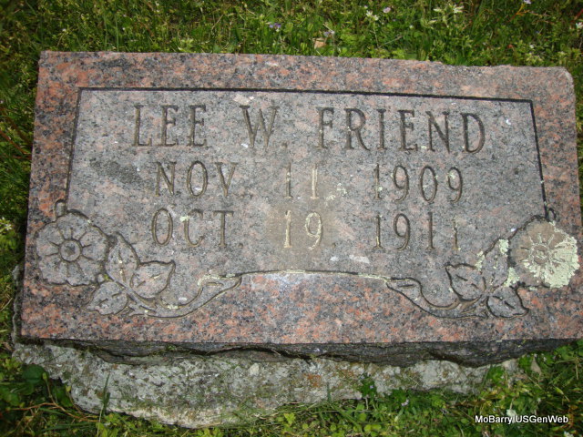 | FRIEND, Lee W. | Nov. 11, 1909 | Oct. 19, 1911 | - Research Note: He was a son of W. W. Friend, born Dade Co., MO, and Oma Mullins, born Barry Co., MO. Probably a twin to Loren Lee. - Another Photo | Note Stefanie Forester Photo Connie Schmidt Photo Vicki Kizer |