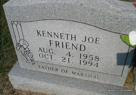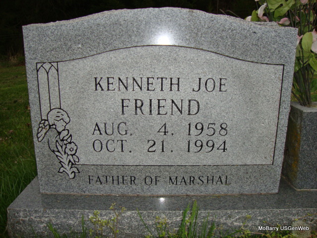 | FRIEND, Kenneth Joe | Aug. 4, 1958 | Oct. 21, 1994 | Inscription: "Father of Marshal" - Research Note: He was a son of Warren Gene and Bertha Pauline (Essary) Friend. - Another Photo | Note Donna Cooper Photo Stefanie Forester |