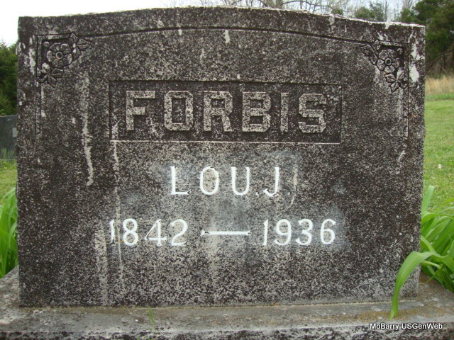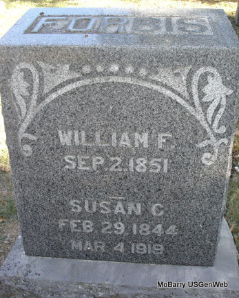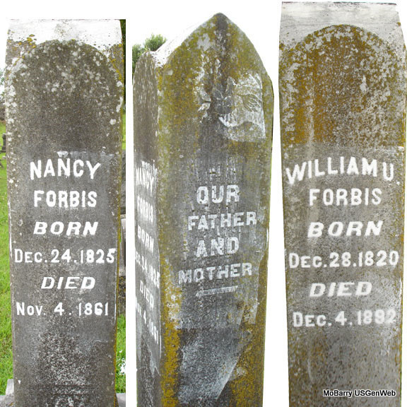 Dec. 4, 1892 | SSW: Nancy Forbis - Inscription: "Our father and mother" - Research Note: Son of John and Elizabeth (McClain/McLean) Forbis. He first married Nancy Alley and second Elizabeth Hines. There was a newspaper item announcing the death of W. U. Forbus and not Forbis as the stone reads. - Cassville Republican, Thursday, December 8, 1892 - Died, at his home on Crane Creek, Sunday, the 4th inst., at the age of 72, W. U. Forbus. Mr. Forbus was one of the oldest and best citizens of Crane Creek township, having moved to the county when a boy of sixteen years old. He leaves a wife and three children to mourn his loss. Thus one by one the venerable wise and good are taken; and soon, a new generation must assume the responsible duties of state and church, so long borne by the fathers. - Grave #108. - Bio | Photo Stefanie Forester Online Newspaper Online Obit Note Donna Cooper |