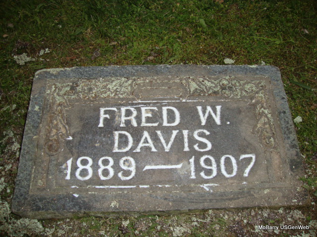 | DAVIS, Fred W. | 1889 | June 13, 1907 | Research Note: Cause of death listed as accident, back broken. Died at age 18 years, 8 months, 15 days. Son of Sarah Ella (Jones) (Davis) Boyd, buried at Osa Cemetery. - Grave #376. | King Funeral Home Jay Trace Census Phyllis Long Photo Connie Schmidt |