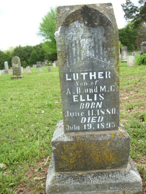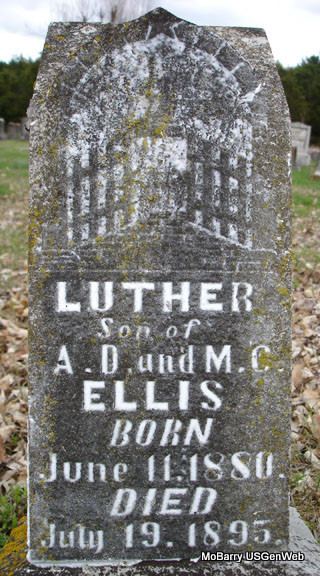 | ELLIS, Luther | June 11, 1880 | July 19, 1895 | Inscription: "Son of A. D. and M. C. Ellis" - Research Note: Son of Alvin E. Ellis and Martha C. Thompson. - Another Photo | Note Phyllis Long Photo Stefanie Forester Photo Connie Schmidt |