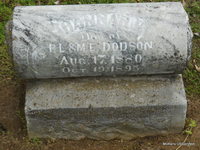 | DODSON, Hannah P. | Aug. 17, 1880 | Oct. 19, 1895 | Inscription: "Dau. of P. L. and M. E. Dodson" - Research Note: Daughter of Peytan L. and Mary E. Dodson. Grave #387. | Note Phyllis Long Photo Vicki Kizer |
